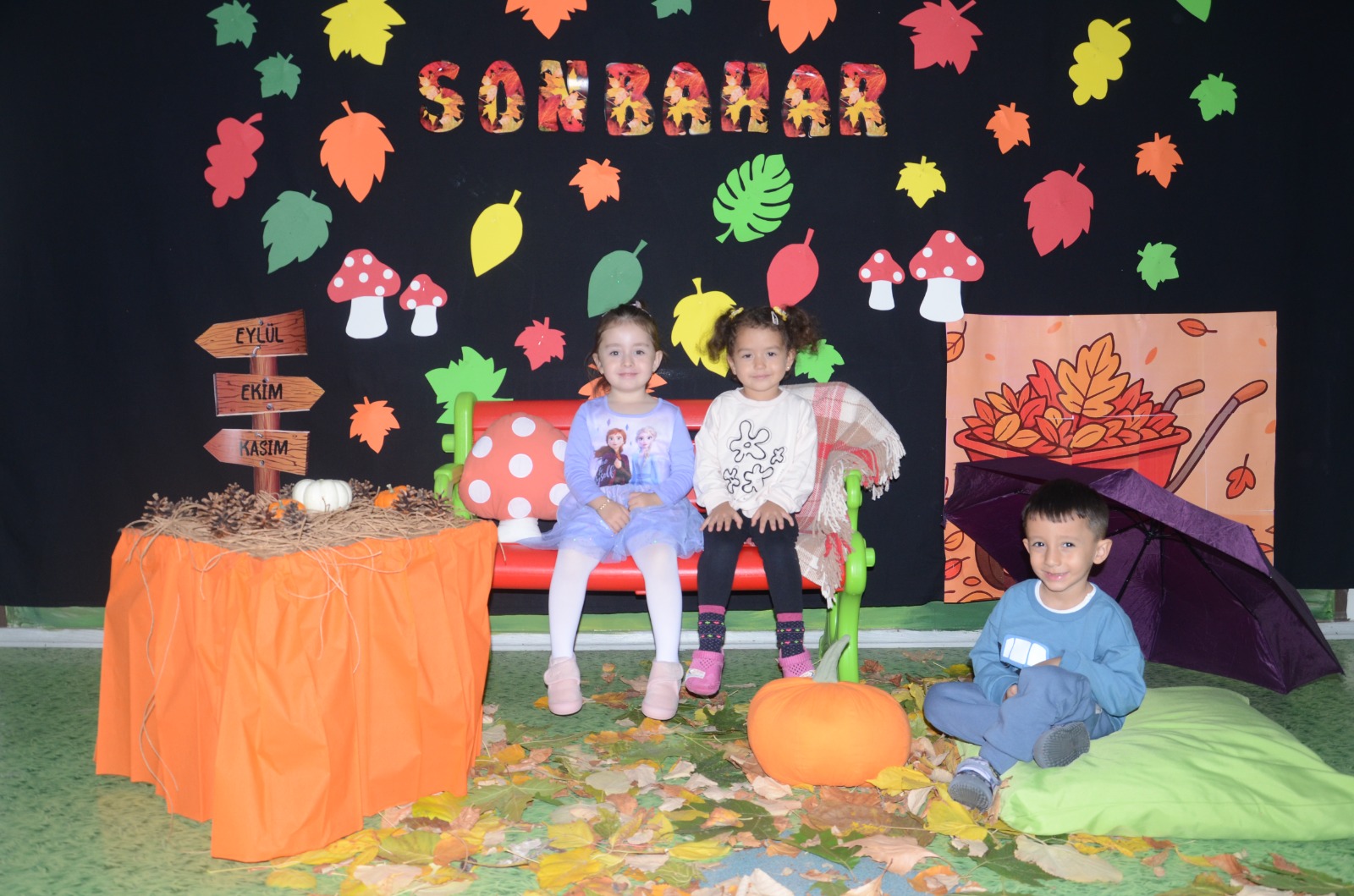 Ders sonunda, okul bahçesinden toplanan yapraklarla ve bal kabakları ile süslenen sonbahar köşesinde çocuklar hatıra fotoğrafı çektirdi.